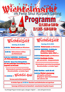 Das Motto "Märchen, Feen, Mystik" zieht sich wie ein roter Faden durch den Wichtelmarkt im Lallinger Winkel, der im zauberhaften Ambiente des Feng Shui Kurparks stattfindet. In entsprechend dekorierten Holzhütten werden winterliche und vorweihnachtliche Waren angeboten, es gibt wärmende Getränke und leckere Speisen, die von den örtlichen Vereinen kredenzt werden. Lassen Sie sich verzaubern vom romantischen Lichtermeer rund um den See und dem entsprechenden Rahmenprogramm für Groß und Klein!